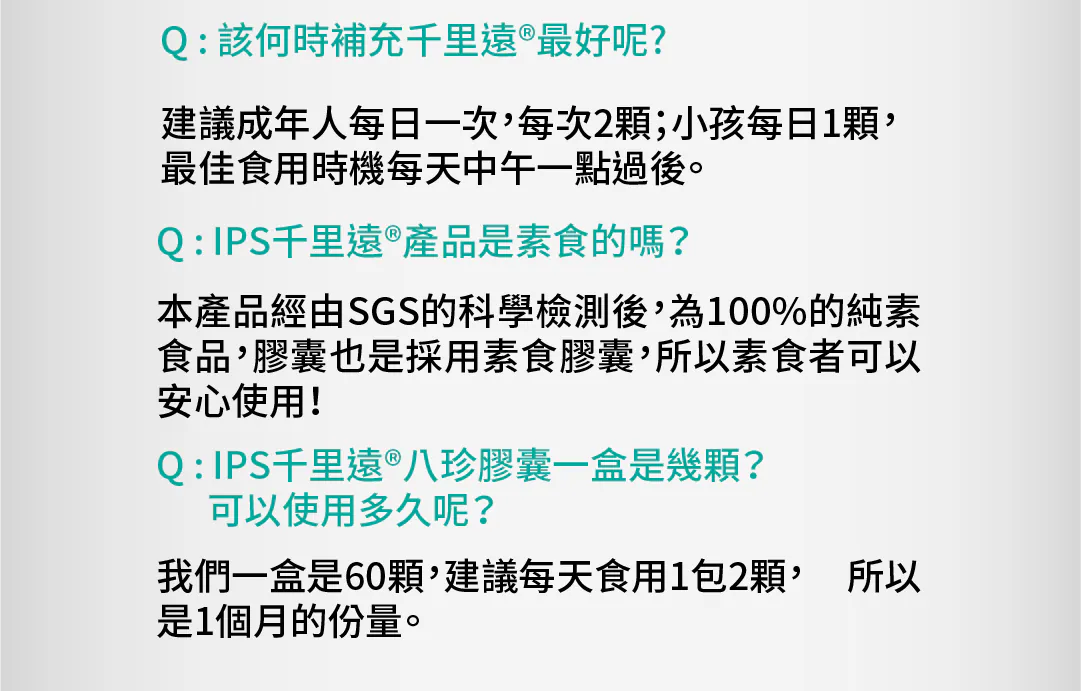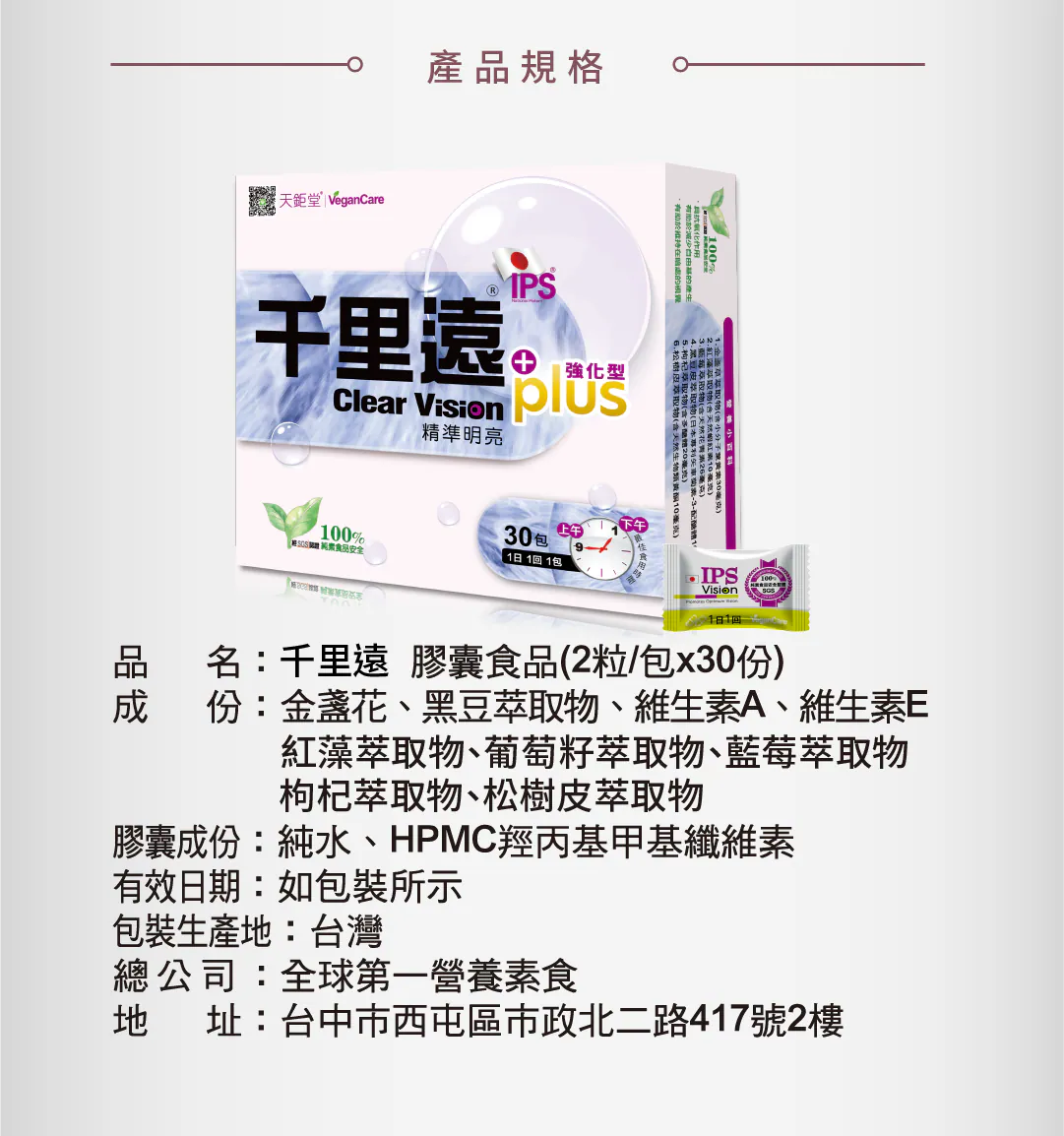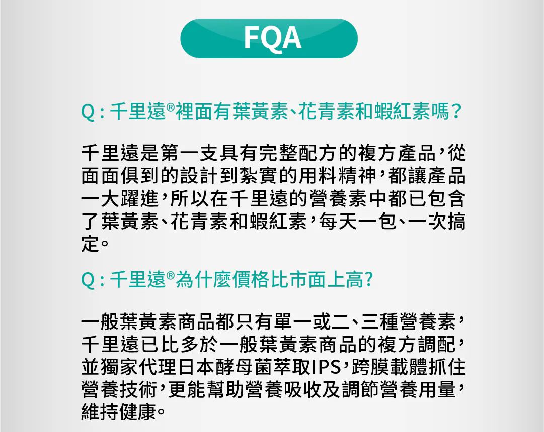 現代生活中,長時間使用電子產品,眼睛經常感到疲勞或不適。這款產品專為長時間對著螢幕的你設計,不管是看書、看電影還是玩遊戲,保持眼睛健康很重要!千里遠營養配方,守護每一雙眼睛,專為現代人設計,使用獨家專利黑豆萃取物IPS,結合葉黃素、藍莓萃取物、花青素等天然成分,每天只需1包,輕鬆補充眼睛所需營養。